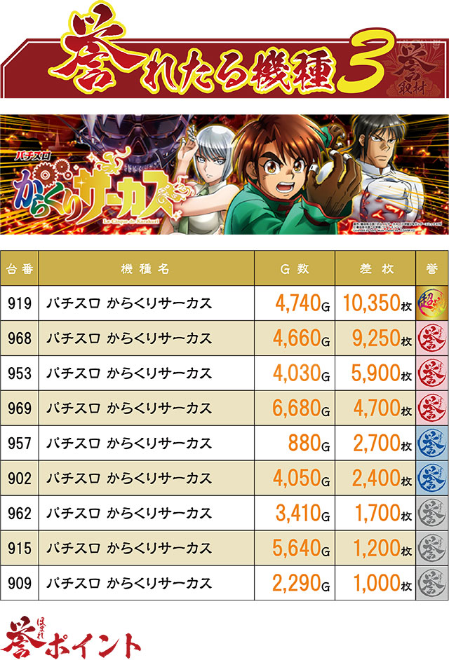 『パチスロ からくりサーカス』からは9台の誉マークが飛び出した。中でも好挙動を見せ、優秀台ならではの動きを見せていたのが上位の4台。打っていた方たちも十分すぎる手応えを感じ取っていたはず。