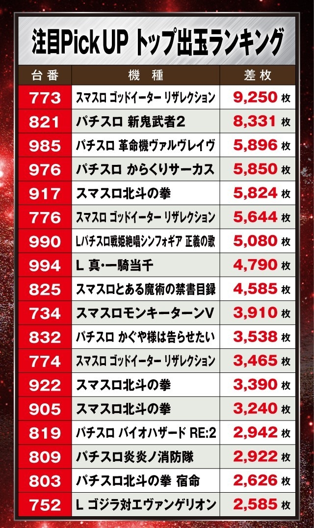 この日、最もプレイヤーの注目を集めたのが『スマスロ ゴッドイーター リザレクション』で、+9,250枚でランキングトップになった773番を筆頭に+5,000枚超、+3,000枚超と複数の好調台を確認できた。