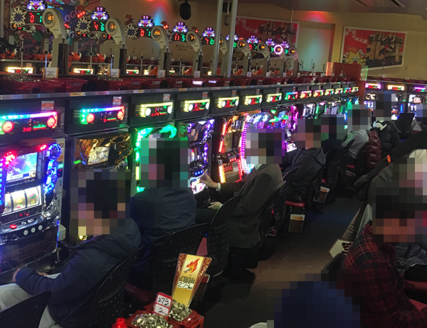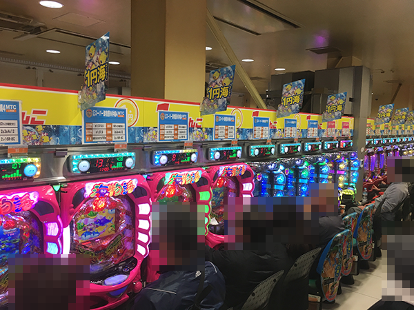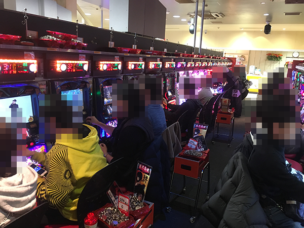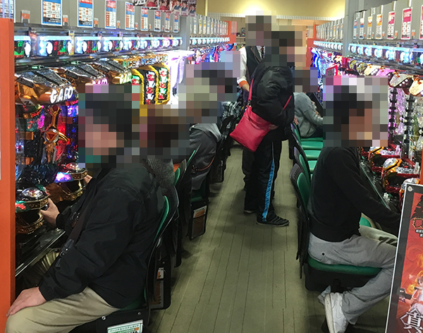 元気のよいスタッフがプレイヤーを迎えているホールに入ると、遊技を楽しむ多くの姿があった。