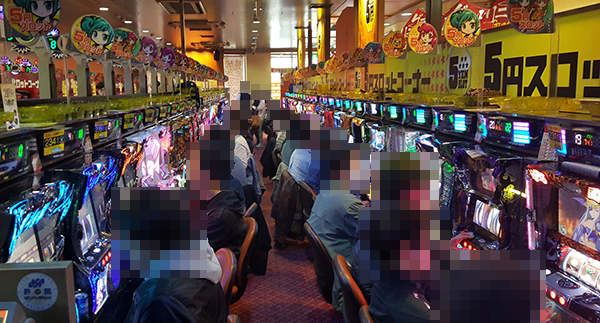 5円パチスロの注目度も高く、空き台はほとんど見当たらない。