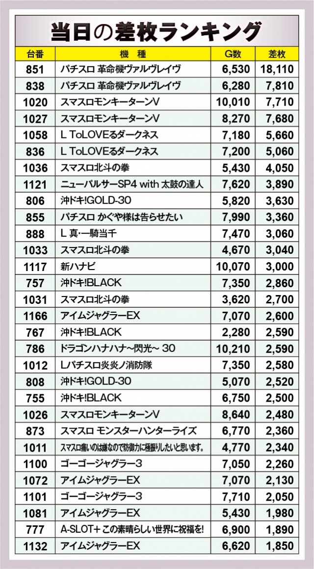 『パチスロ 革命機ヴァルヴレイヴ』にて18,000枚OVERという凄まじい熱気が放たれると、『スマスロモンキーターンV』から7,000枚OVER、さらに『L ToLOVEるダークネス』では5,000枚OVERと大台突破台が続いている。またAT機のみならず『沖ドキ』シリーズも好調、さらに『新ハナビ』『ドラゴンハナハナ~閃光~ 30』は万回転OVERを達成するなど、ノーマル機も大活躍していた。