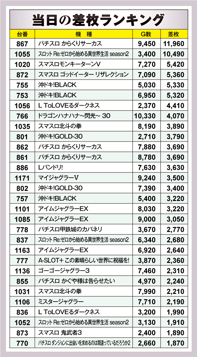 優秀台を見てみると、トップに立ったのは867番台が+11,960枚を記録した『パチスロ からくりサーカス』。すっかり定番人気機種としての地位を獲得している。僅差で続いたのが『スロット Re:ゼロから始める異世界生活 season2』。1055番台が+10,490枚をマーク。こちらも前作以上のヒットが期待される注目作だが、その期待に十分応えてくれそうだ。この2つの大台突破台には差をつけられたが、3番手となったのは1020番台が+5,420枚だった『スマスロモンキーターンV』。この機種も定番機種として人気を誇っている。以下、+5,360枚の『スマスロ ゴッドイーター リザレクション』872番台、『沖ドキ!BLACK』の+5,330枚の755番台、同じく+5,320枚の753番台、+4,410枚の『L ToLOVEるダークネス』1056番台、+4,070枚の『ドラゴンハナハナ~閃光~ 30』766番台、+3,890枚の『スマスロ北斗の拳』1035番台、++3,790枚の『沖ドキ!GOLD-30』801番台と続いた。