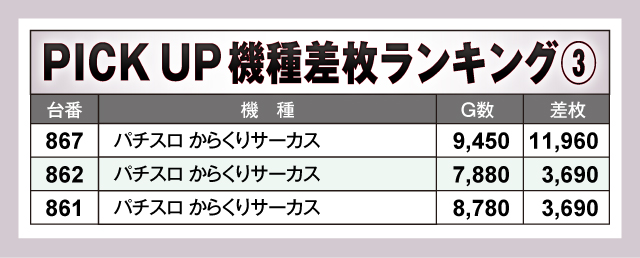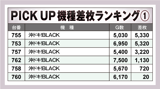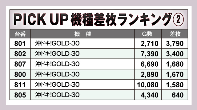差枚トップ30台に沖スロが4台入っているように、沖スロの活躍が目立った。実際、ピックアップ機種の『沖ドキ!BLACK』は8台中6台がプラスで、そのうちの2台は+5,000枚オーバーを記録している。『沖ドキ!GOLD-30』も12台中5台がプラスで、うち2台は+3,000枚オーバー。『パチスロ からくりサーカス』も6台中3台がプラスで、その中の1台は万枚達成台だった。