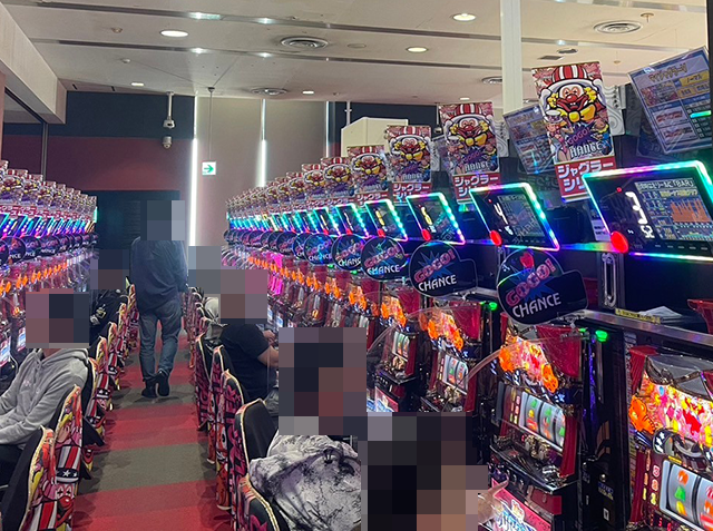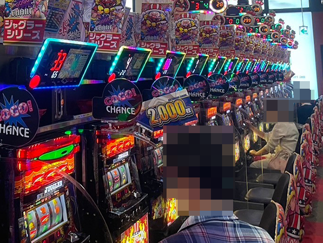 「マイジャグラーⅤ」や「アイムジャグラーEX」などがにぎわっており、笑顔のプレイヤーも多い。