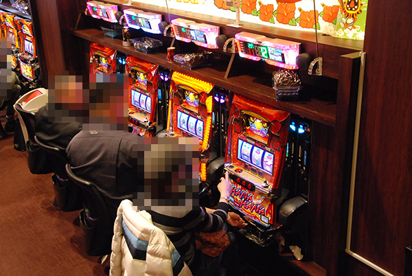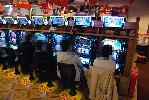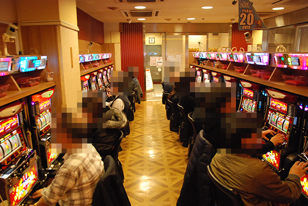 午後の20円パチスロでは、「バジリスク~甲賀忍法帖~絆」や「パチスロ モンキーターンⅢ」などが大盛況。明るい表情のプレイヤーが多く、各シマが鮮やかなムードにつつまれていた。