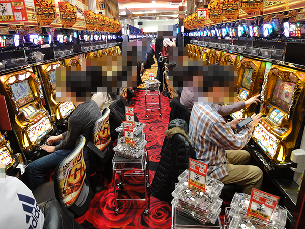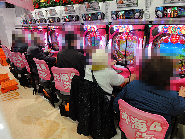 午後の4円パチンコでは前日に引き続き、「CRスーパー海物語IN沖縄4」や「ぱちんこCR真・北斗無双」が大盛況。うれしそうな姿が多く、各シマに魅力的な光景が広がっていた。