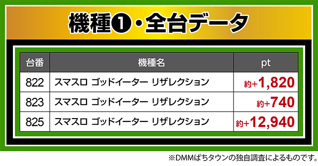 すべての台がプラスとなり、825番台は約+12,948pt!!