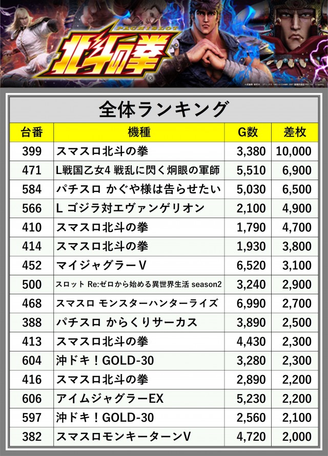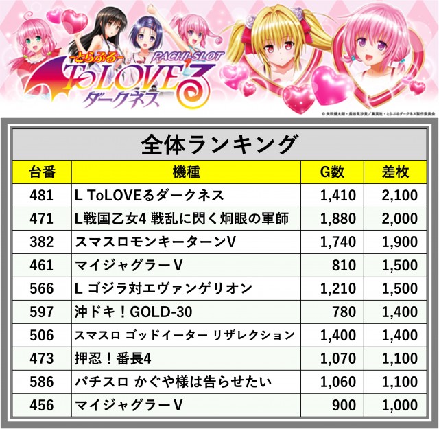 厳選された取材対象機種をはじめ、その他スロット全体から好記録が飛び出した!プレイヤーが楽しんだ1日を下記データにて振り返ってみて欲しい。