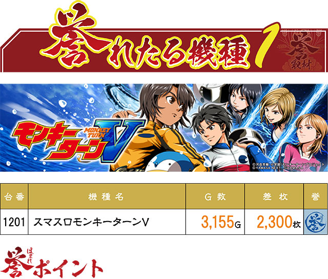3台中1台だけがプラス差枚&青誉マーク(=2,000枚以上)だった『スマスロモンキーターンV』。残る2台が2,000G未満しか回されてないため、この結果も仕方のないこと。1201番台ももっと回されていたら赤誉マーク(=3,000枚以上)に昇格していた…!?