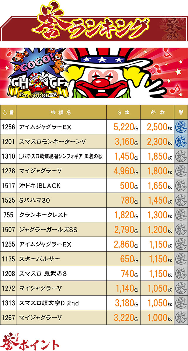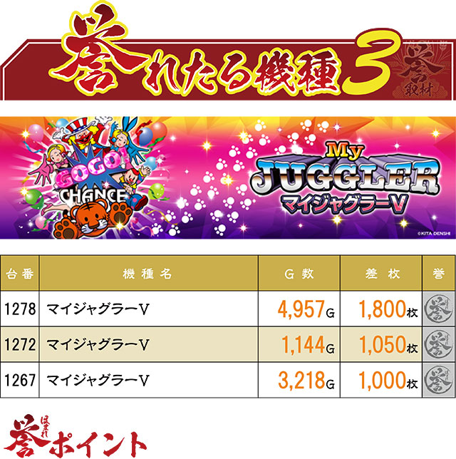 『マイジャグラーⅤ』からは3台の誉マーキングが出現。1278番台が快調にボーナスを生み出していたが、最終的に青誉マークには届かず…。それでも十分な手応えを感じさせてくれたようだ。