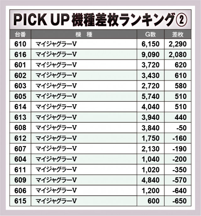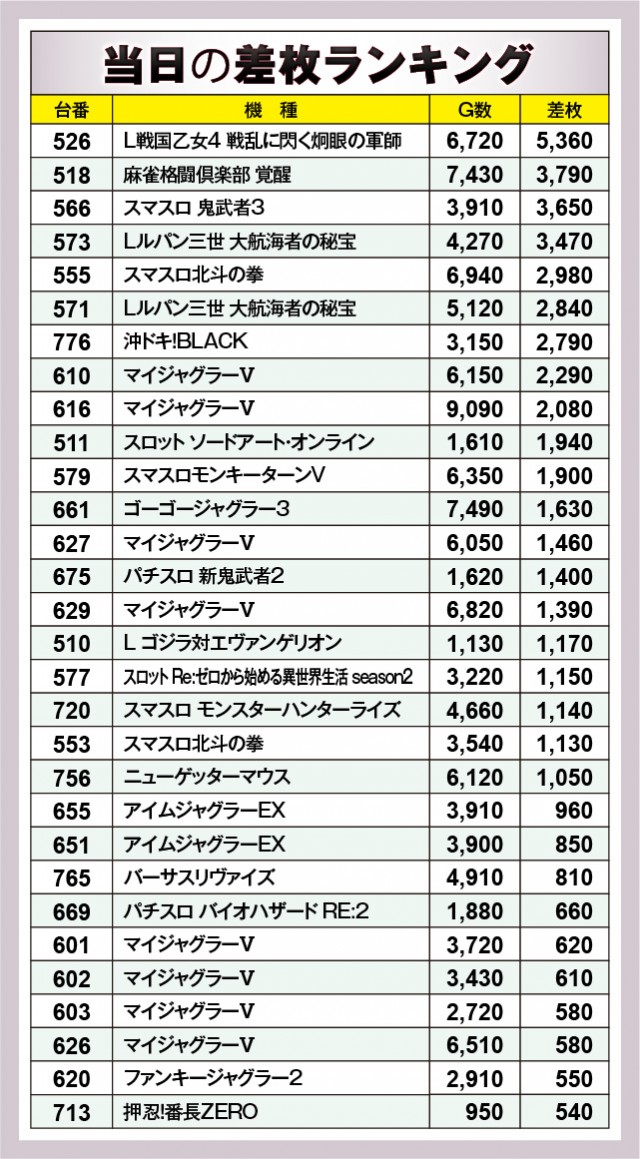 当日は『L戦国乙女4 戦乱に閃く炯眼の軍師』から5,000枚OVERが飛び出し、ほかにもまとまった出玉を確保する台が多く見られた。AT機の活躍が目立つのはもちろんだが、それ以上に『ジャグラー』シリーズを筆頭としたノーマル機の躍進が見て取れる。いずれもコンスタントに大当りを射止めており、シンプルながら遊技していたファンの心は満たされたことだろう。