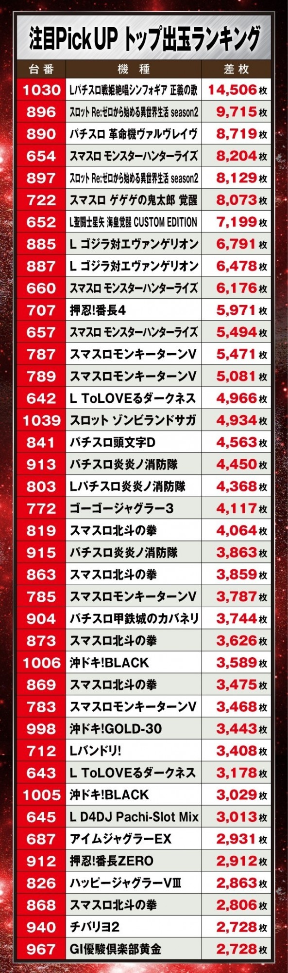 また、その他の機種で目立っていたのが、導入直後の新台『スマスロ モンスターハンターライズ』で、654番台の+8,204枚を筆頭に660番台が+6,000枚超、657番台が+5,000枚超とそのポテンシャルの高さを早くも発揮していた。