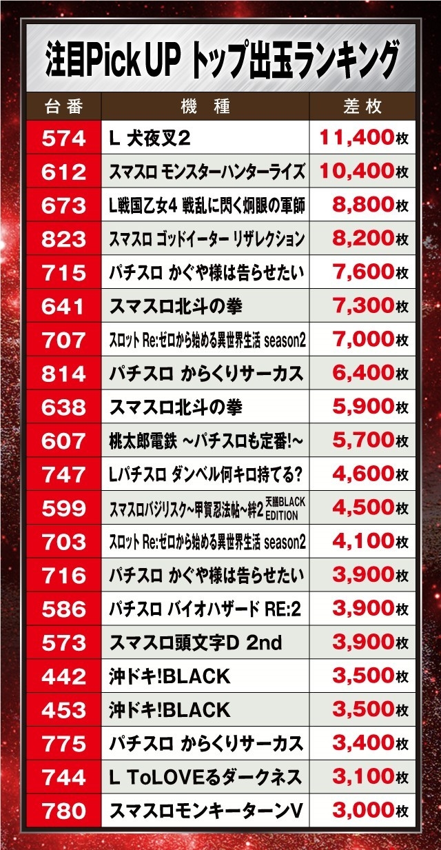 この日の様子をチェックしてみると、『L 犬夜叉2』が+11,400枚を叩き出しランキングトップに。次いで『スマスロ モンスターハンターライズ』も万枚超を達成するなど、ランキング上位が非常にハイレベルな成績を残している。