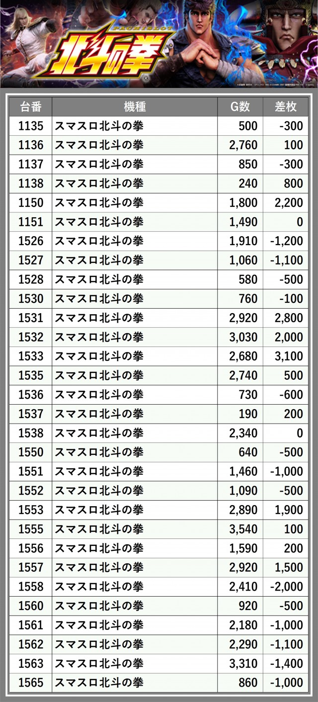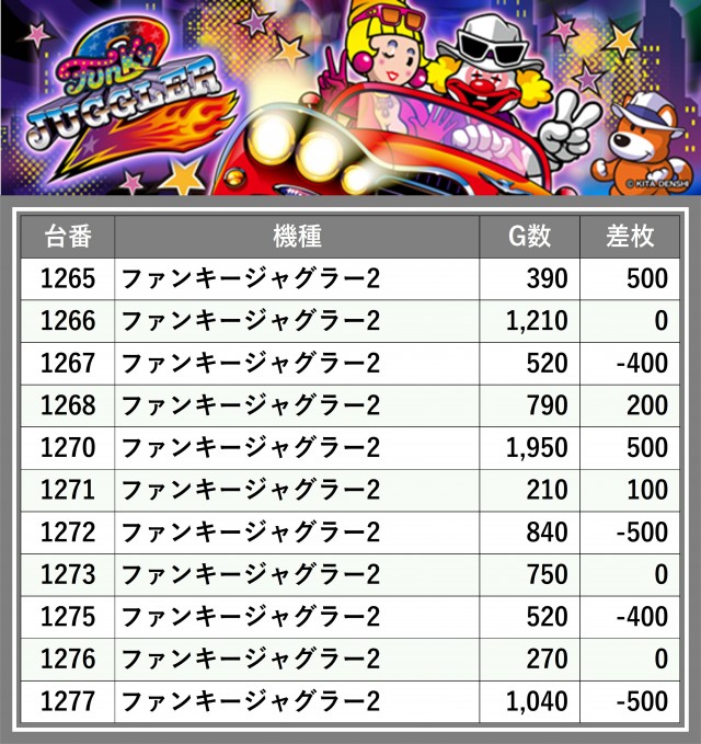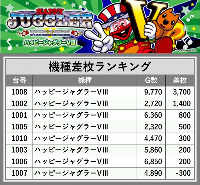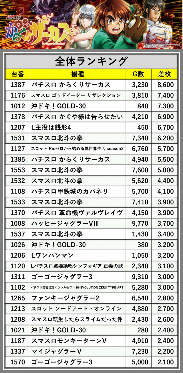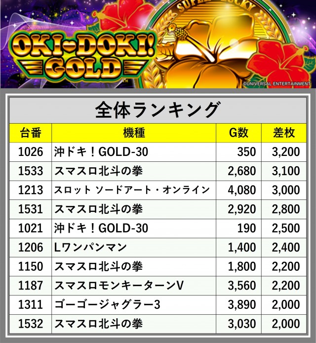 厳選された取材対象機種をはじめ、その他スロット全体から好記録が飛び出した!プレイヤーが楽しんだ1日を下記データにて振り返ってみて欲しい。