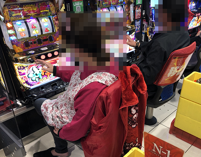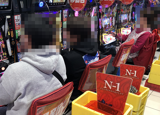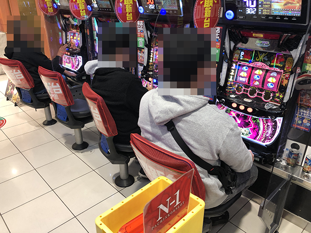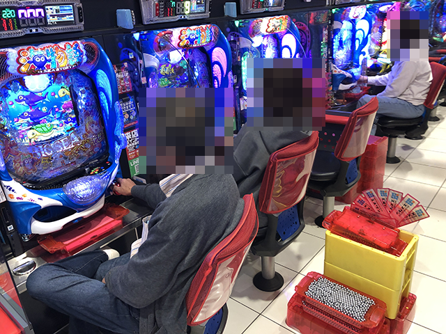 16時過ぎには3名が座っており、2名が3箱以上、1名が2箱以上の持ち玉を使って遊技をおこなっていた。