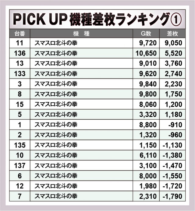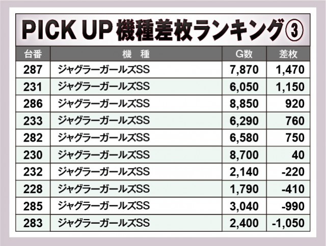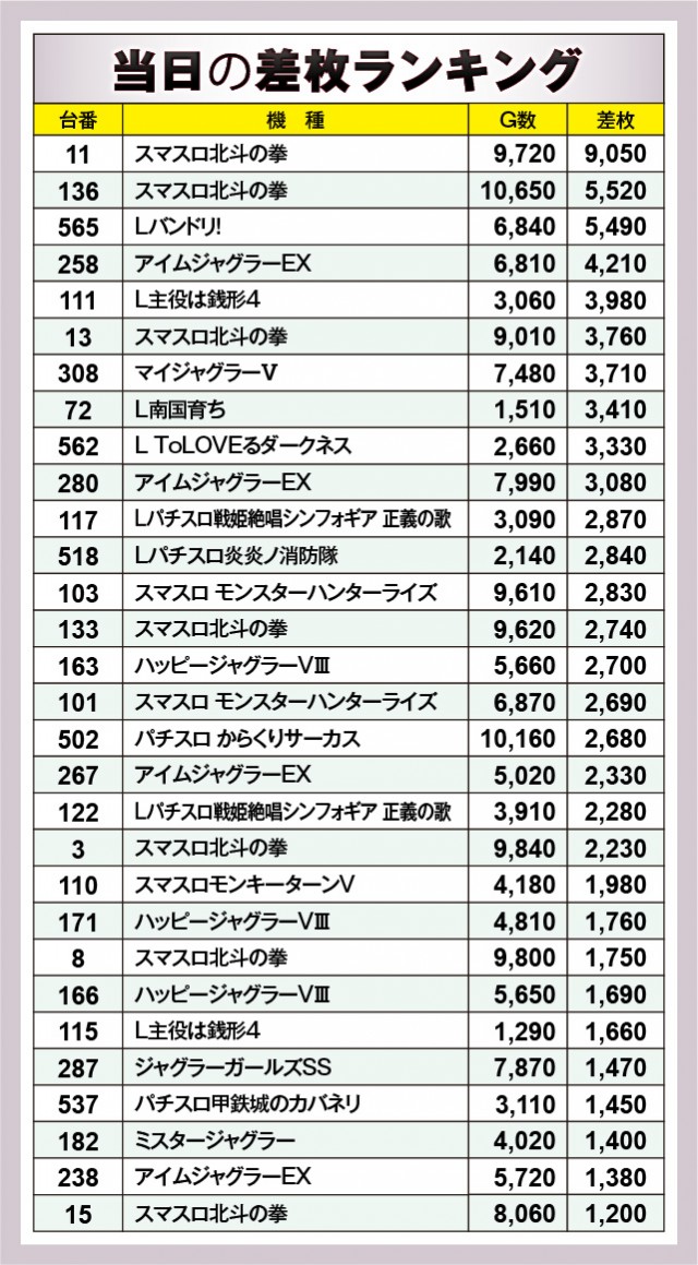 惜しくも万枚到達を逃した『スマスロ北斗の拳』だが、それでも9,000枚OVERという数字は店内を盛り上げるのに十分なものとなっている。同機種は回転数の面でも貢献しており、万回転OVERはもちろん、8~9,000回転OVERが続出していたのも見逃せない。また『ジャグラー』シリーズの名前も目立っており、コンスタントなGOGOランプの輝きはファンを笑顔にしていたことだろう。