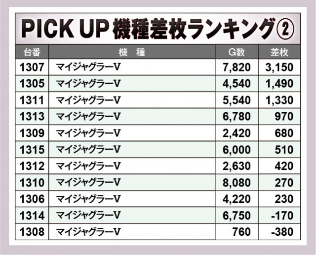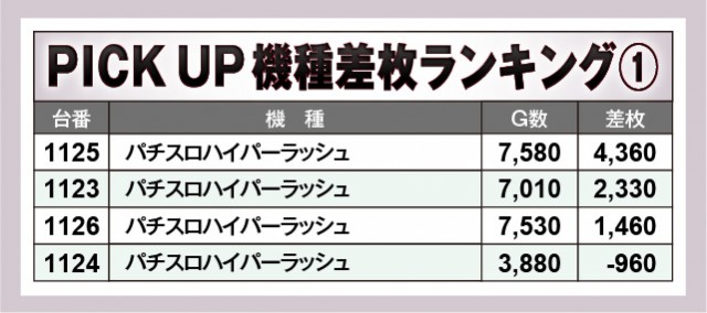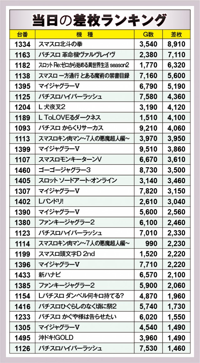 『スマスロ北斗の拳』8,910枚や『パチスロ 革命機ヴァルヴレイヴ』7,000枚OVERなど、スマスロの盛り上がりを牽引する両機種が熱気を放っていた。そして『マイジャグラーⅤ』や『パチスロハイパーラッシュ』といったノーマル機群も奮闘しており、老若男女問わず幅広いファンが楽しめる状況だったと言える。また幅広い機種が名を連ねているのも鮮烈で、同店の気概が感じられる内容だ。