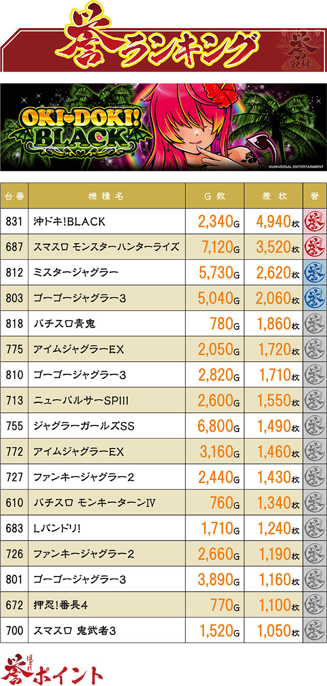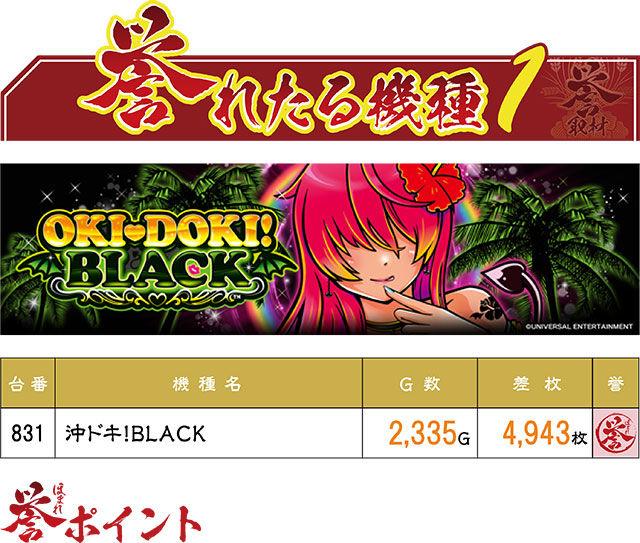 初・誉取材日の最高差枚記録を生み出したのは『沖ドキ!BLACK』。その記録は5,000枚にわずかに届かない数値であり、誉ランキングの首位レコードとしてはやや物足りない結果に…。全体的な総ゲーム数不足が伸び悩んだ要因かもしれない。