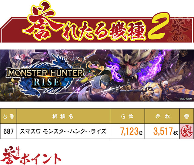 少し前に新台として仲間入りしたばかりの『スマスロ モンスターハンターライズ』から、赤誉マークが誕生!1台設置でありながら、優秀結果を残してくれた。これは1台機種コーナーにもチャンスが潜んでいた証!