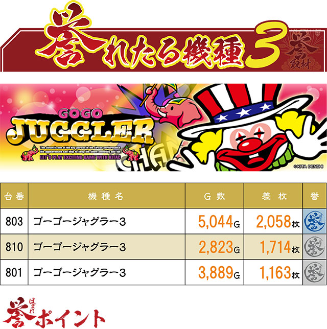 10台中6台がプラス、つまり勝率6割をマークしていた『ゴーゴージャグラー3』。残念ながら3,000枚オーバー台は生まれなかったが、好挙動を見せた台は複数あり。総ゲーム数次第ではもっと伸びていたのではないだろうか。