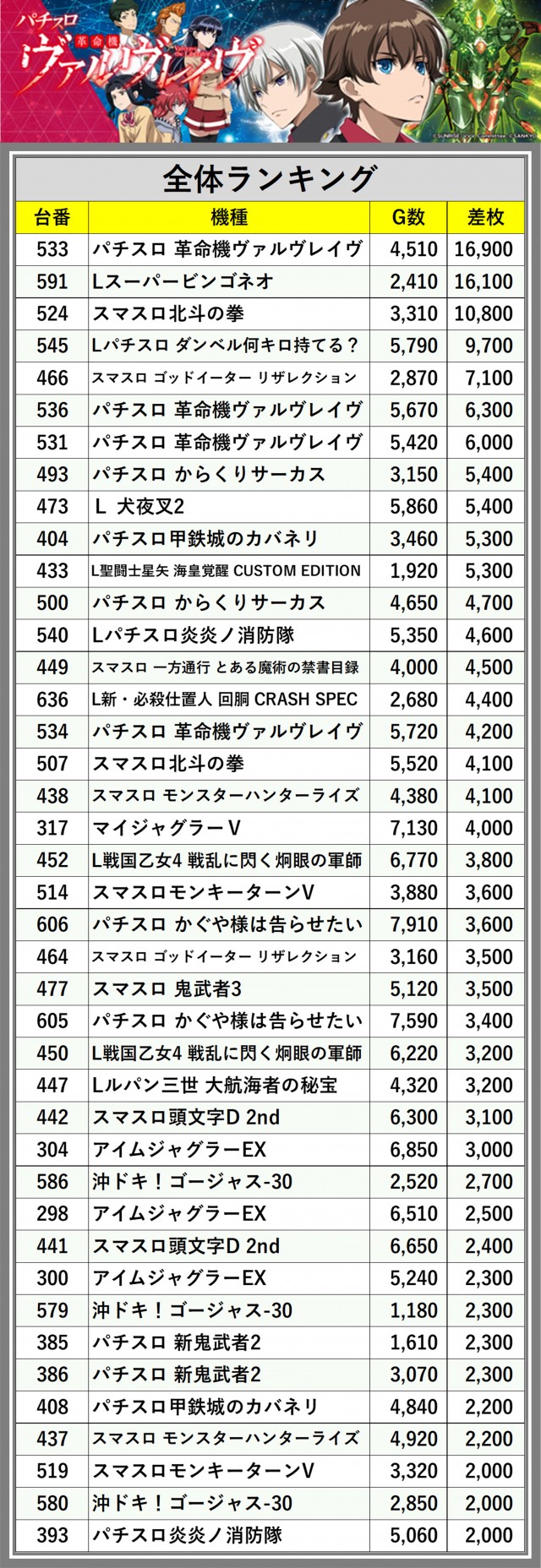 厳選された取材対象機種をはじめ、その他スロット全体から好記録が飛び出した!プレイヤーが楽しんだ1日を下記データにて振り返ってみて欲しい。
