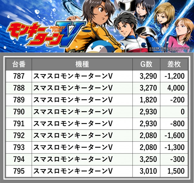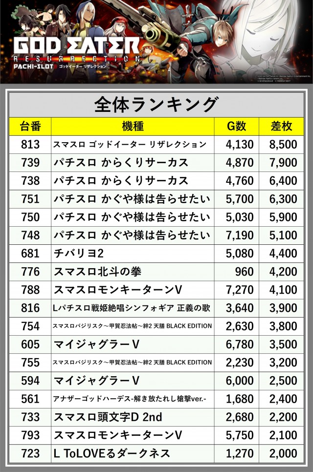 厳選された取材対象機種をはじめ、その他スロット全体から好記録が飛び出した!プレイヤーが楽しんだ1日を下記データにて振り返ってみて欲しい。