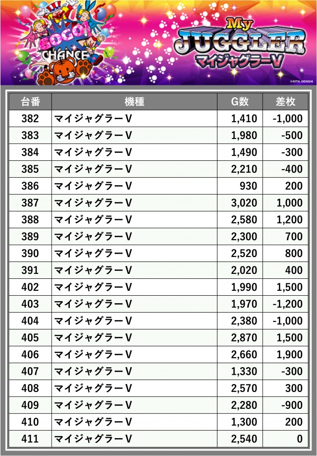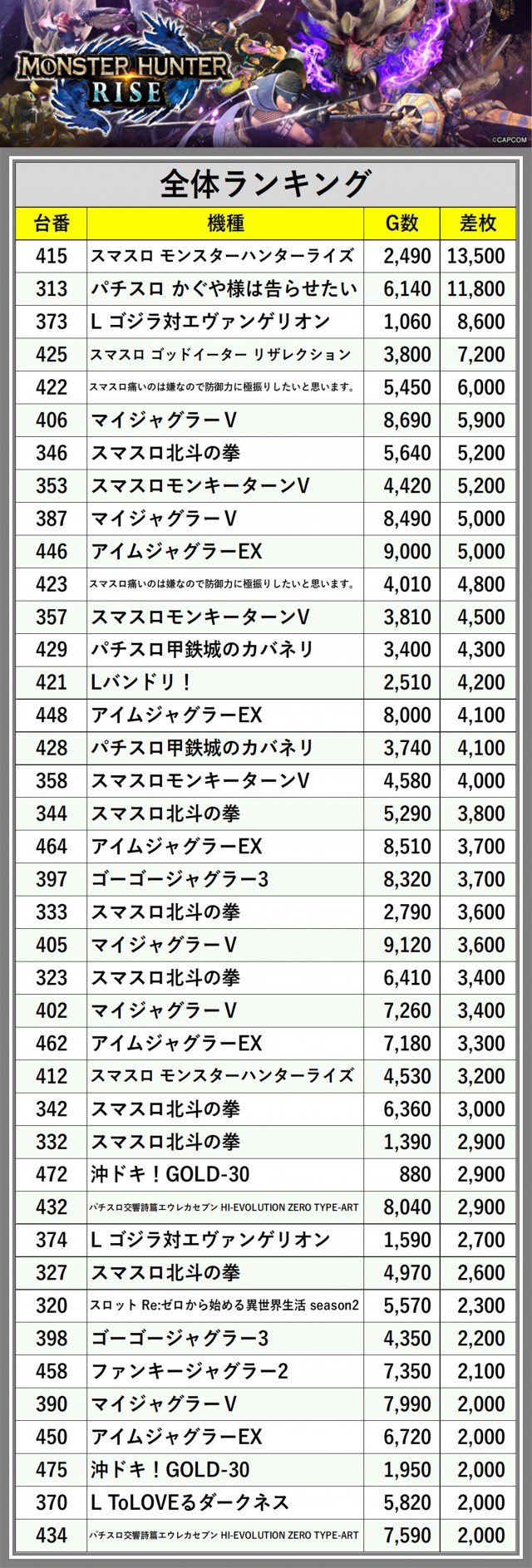 厳選された取材対象機種をはじめ、その他スロット全体から好記録が飛び出した!プレイヤーが楽しんだ1日を下記データにて振り返ってみて欲しい。