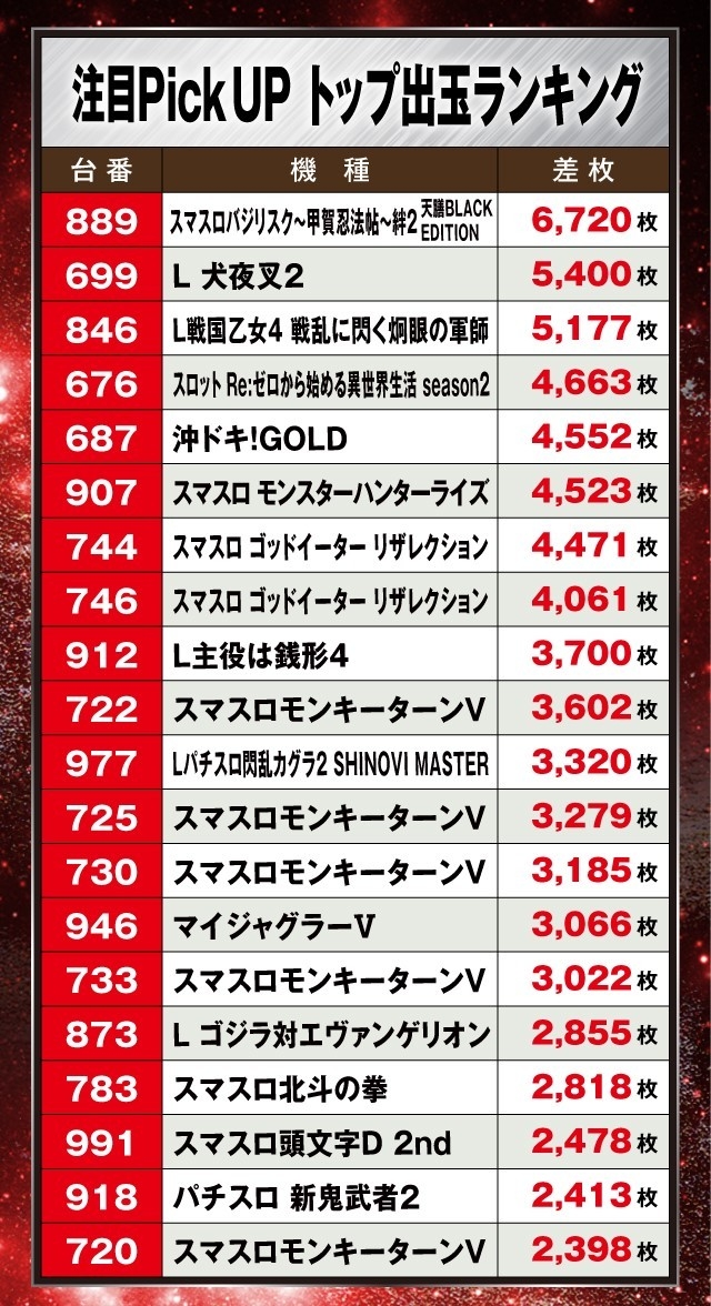 この日、最もプレイヤーの注目を集めたのが『スマスロバジリスク~甲賀忍法帖~絆2 天膳BLACK EDITION』で+6,720枚を叩き出しランキングトップに、次いで導入間もない新台『L 犬夜叉2』が+5,400枚を記録し2位にランクインしている。