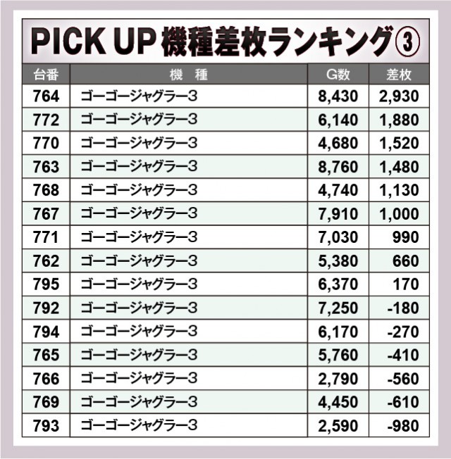 当日は『ジャグラー』シリーズが大きな存在感を放っており、各所でGOGOランプが光り輝いていた様子だ。『マイジャグラーⅤ』『アイムジャグラーEX』はコンスタントなボーナス当選によって3,000枚OVERを達成しており、まとまった出玉を確保する台が目立っていたのが鮮烈であるばかり。もちろん『ゴーゴージャグラー3』『ウルトラミラクルジャグラー』も高い活気を披露し、満足度の高い1日を提供していた。
