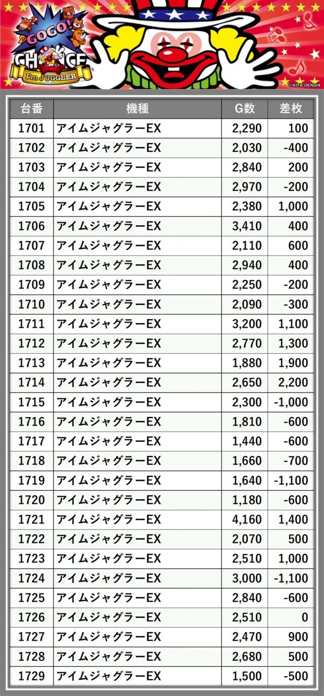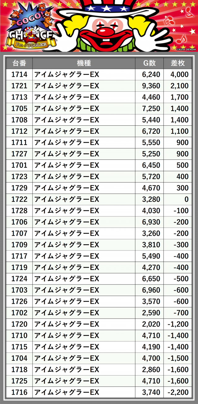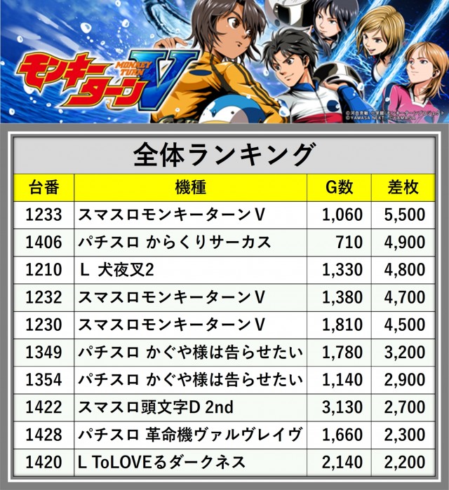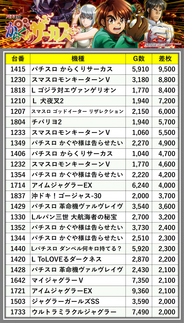 厳選された取材対象機種をはじめ、その他スロット全体から好記録が飛び出した!プレイヤーが楽しんだ1日を下記データにて振り返ってみて欲しい。