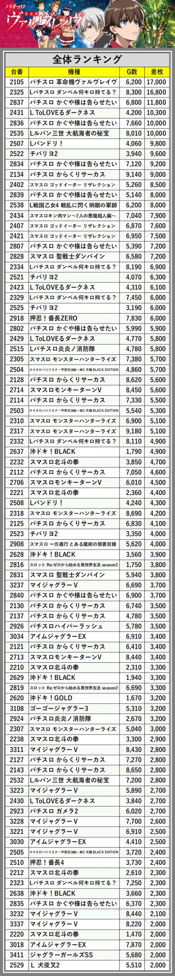 厳選された取材対象機種をはじめ、その他スロット全体から好記録が飛び出した!プレイヤーが楽しんだ1日を下記データにて振り返ってみて欲しい。
