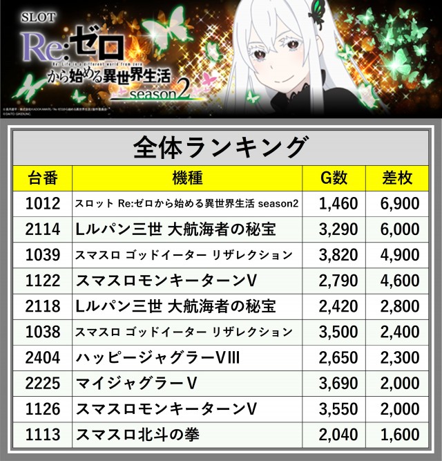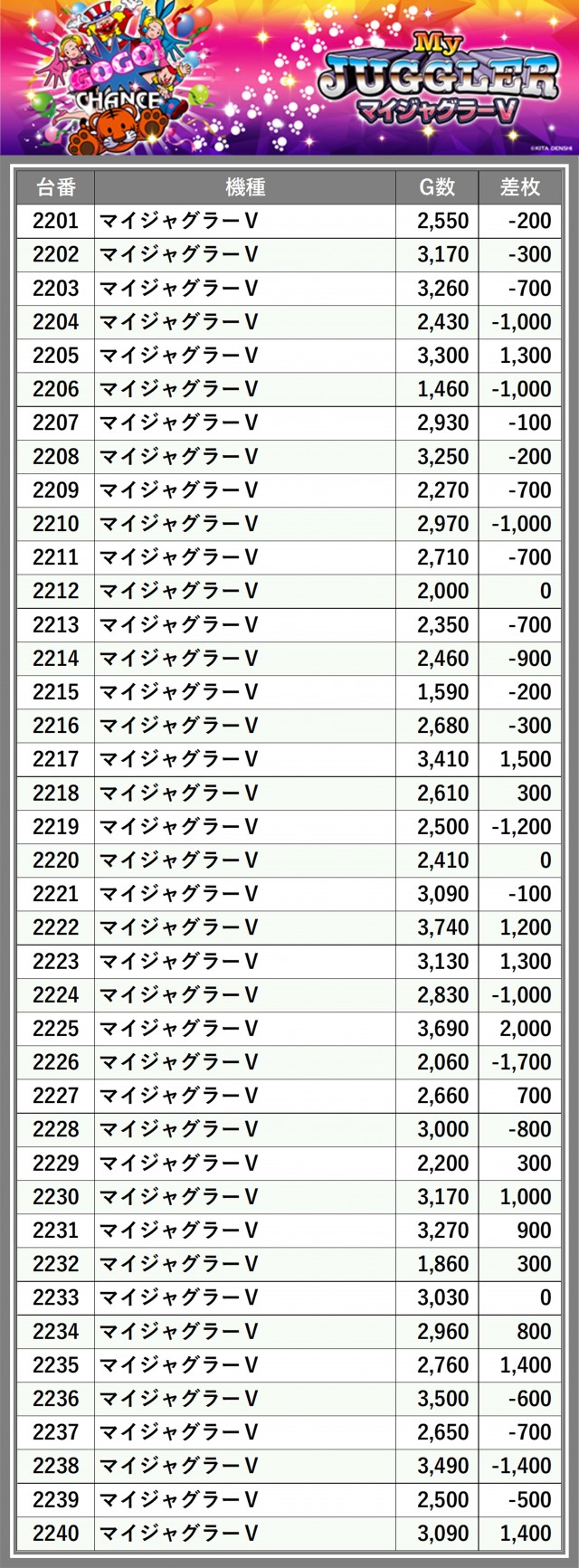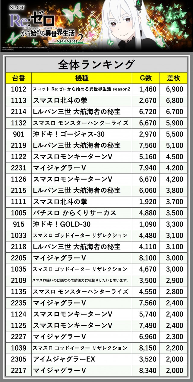 厳選された取材対象機種をはじめ、その他スロット全体から好記録が飛び出した!プレイヤーが楽しんだ1日を下記データにて振り返ってみて欲しい。