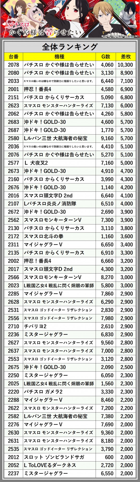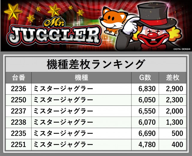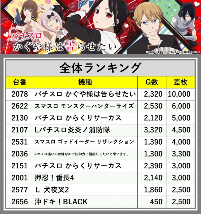 厳選された取材対象機種をはじめ、その他スロット全体から好記録が飛び出した!プレイヤーが楽しんだ1日を下記データにて振り返ってみて欲しい。