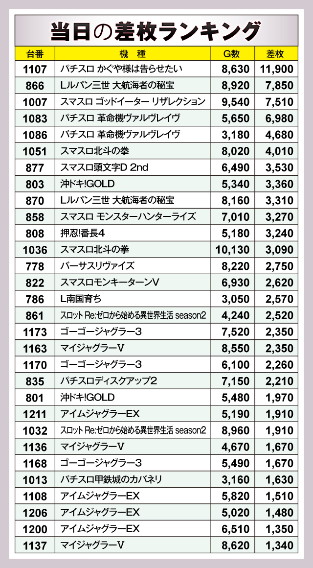 トップに輝いたのは『パチスロ かぐや様は告らせたい』。1107番台が+11,900枚と見事に万枚を突破している。そして『Lルパン三世 大航海者の秘宝』866番台が+7,850枚、『スマスロ ゴッドイーター リザレクション』1007番台が+7,510枚と活躍を見せた。