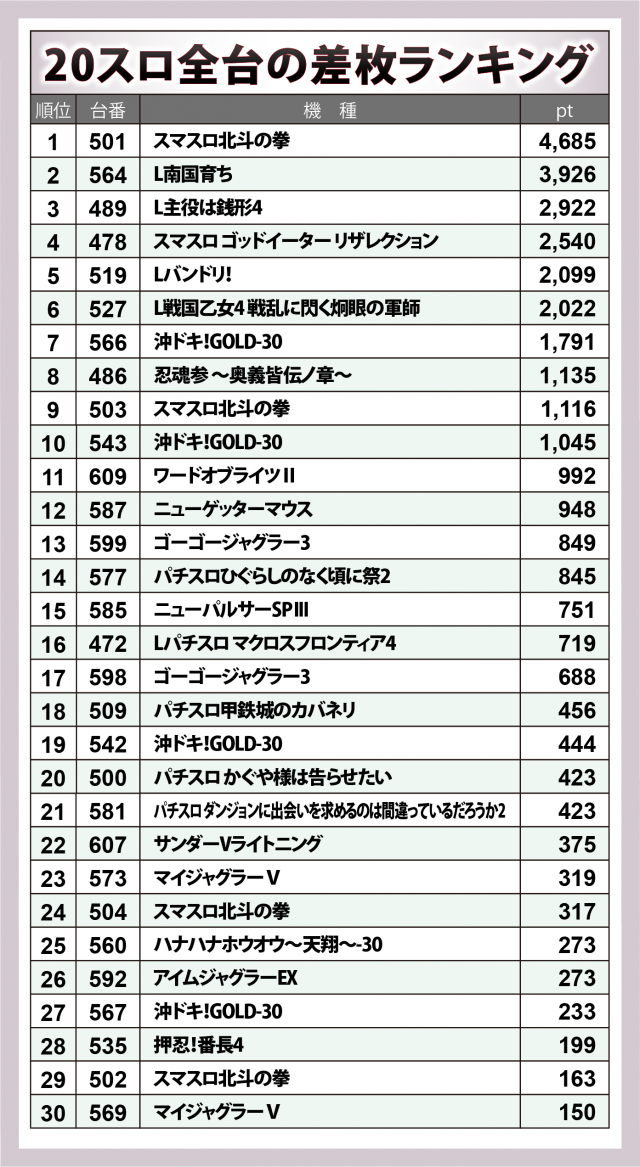 プラスを成し遂げた上位30台の成績を見ると、悔しいことに万枚オーバーは数えることができなかったが、30台のうち4桁プラスは10台、+2,000枚以上は6台、+3,000枚以上は2台、+4,000枚オーバーは1台となった。