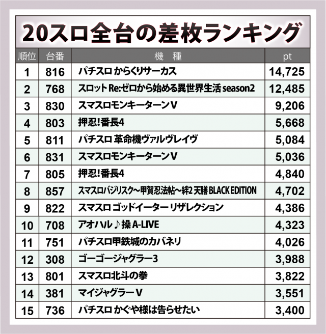 万枚オーバーが2台の上にベスト15はいずれも高水準となる数値を導き、冒頭で述べた主旨に大きく叶う内容となったことは喜ばしい。