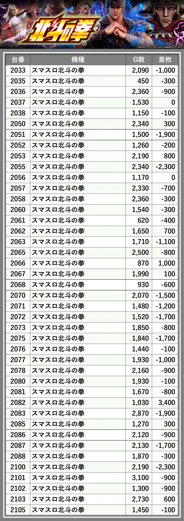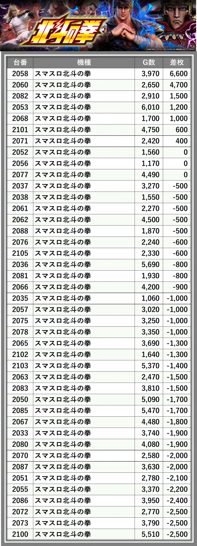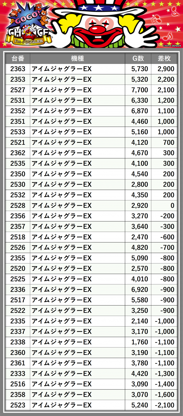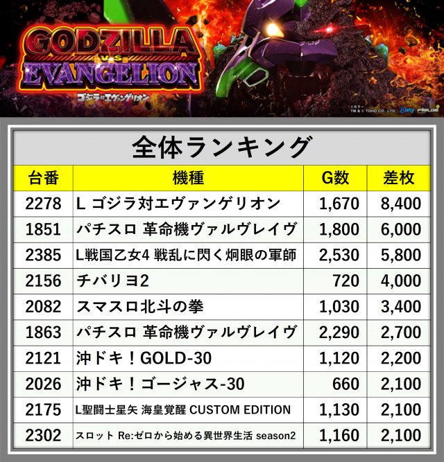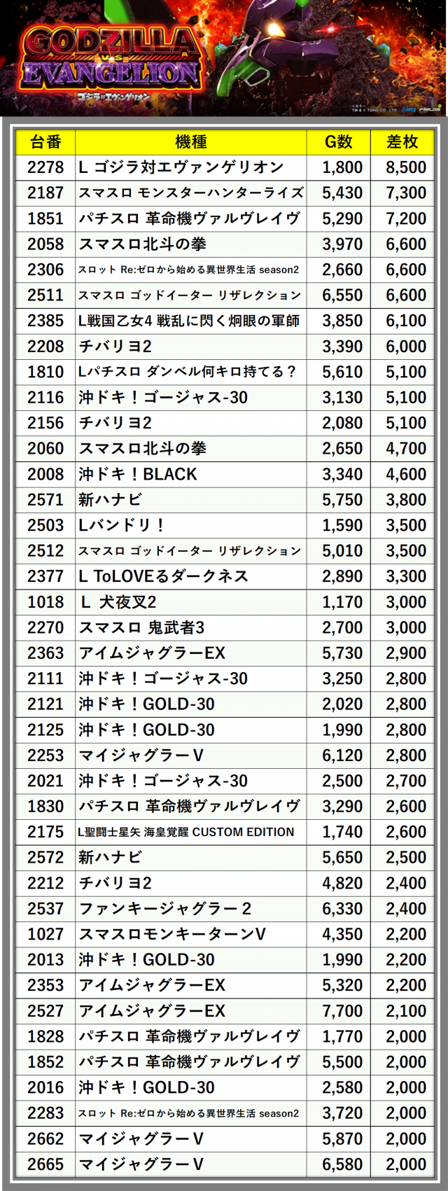 ※差枚数順に掲載しています