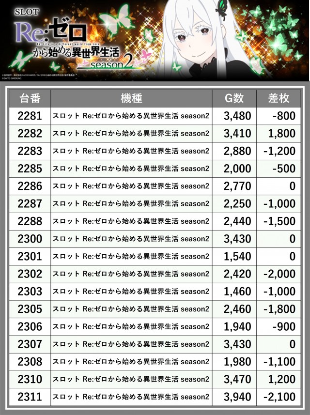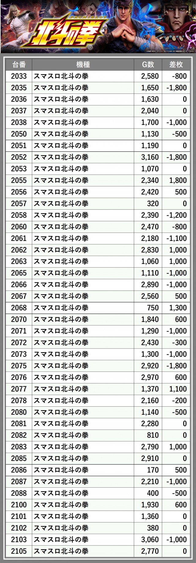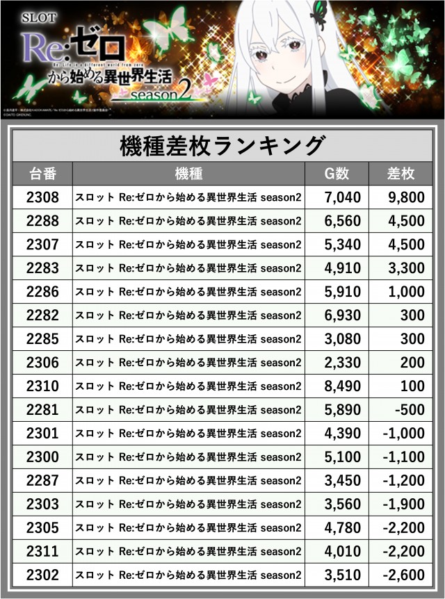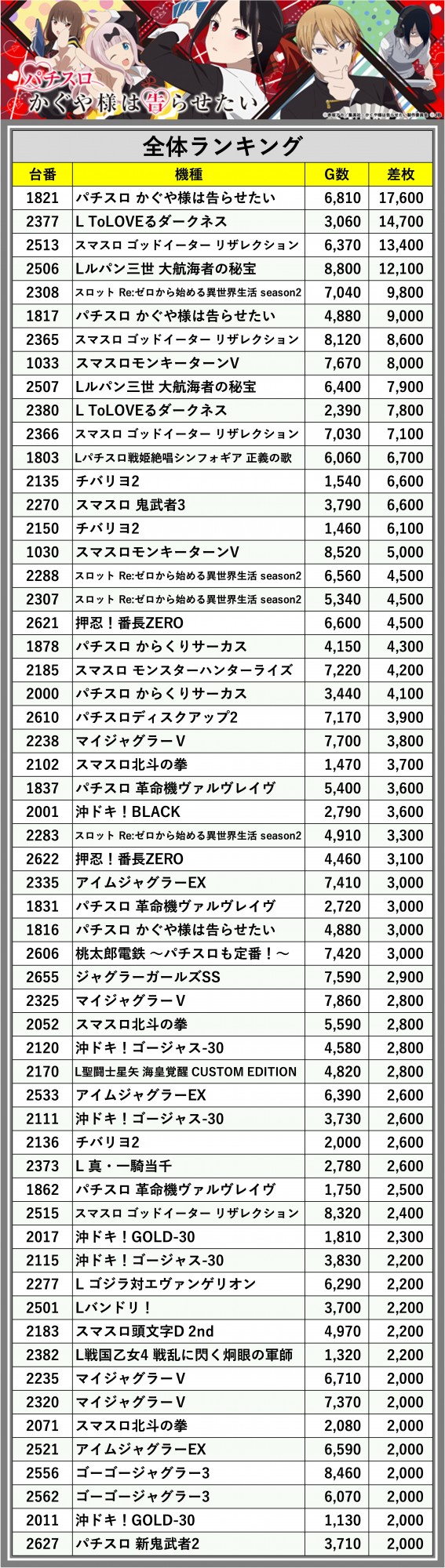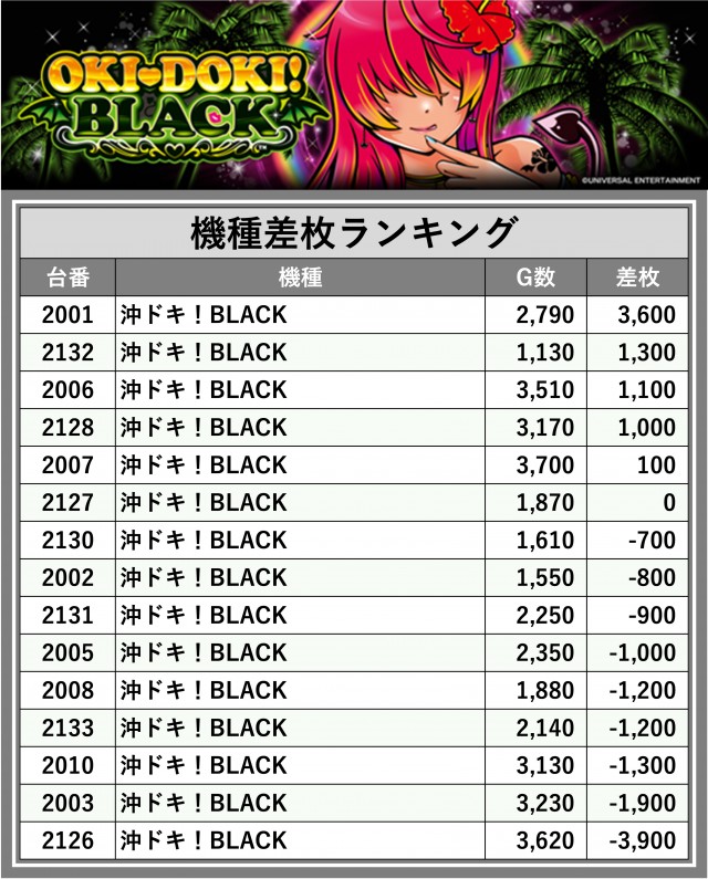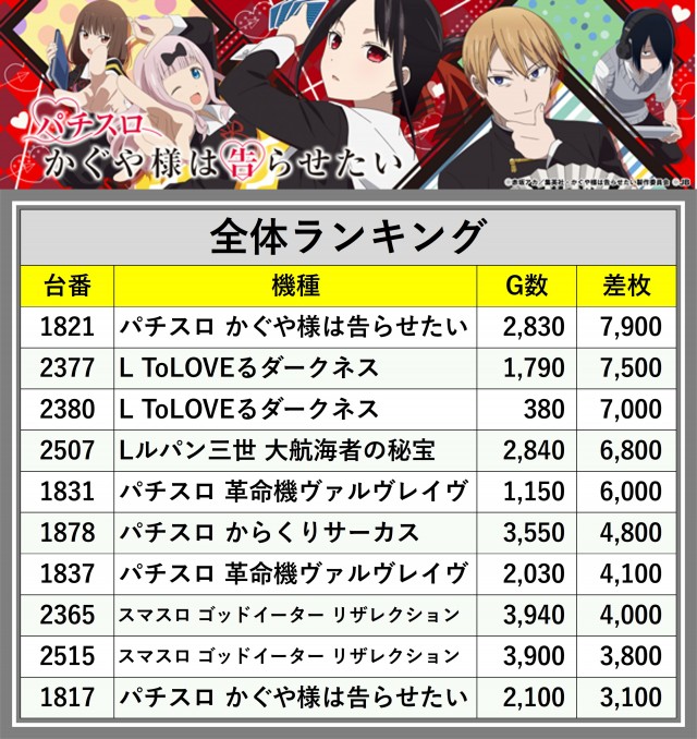 ※差枚数順に掲載しています