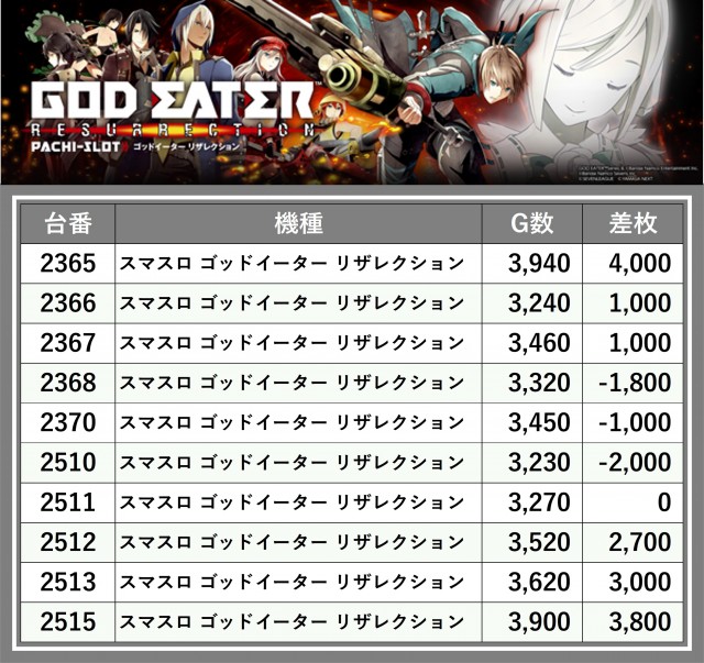 厳選された取材対象機種をはじめ、その他スロット全体から好記録が飛び出した!プレイヤーが楽しんだ1日を下記データにて振り返ってみて欲しい。