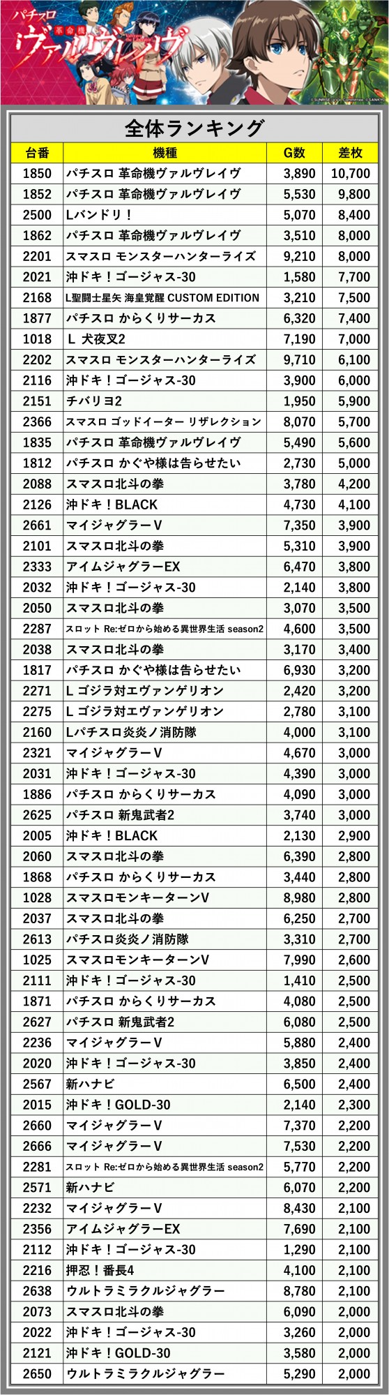 厳選された取材対象機種をはじめ、その他スロット全体から好記録が飛び出した!プレイヤーが楽しんだ1日を下記データにて振り返ってみて欲しい。