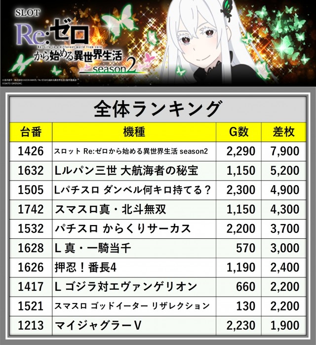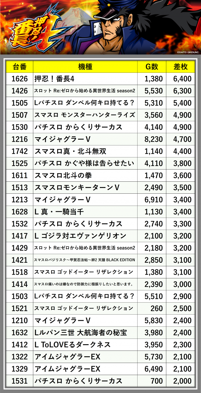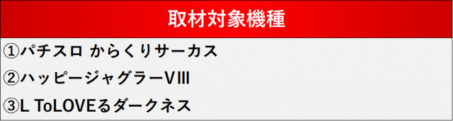 厳選された取材対象機種をはじめ、その他スロット全体から好記録が飛び出した!プレイヤーが楽しんだ1日を下記データにて振り返ってみて欲しい。