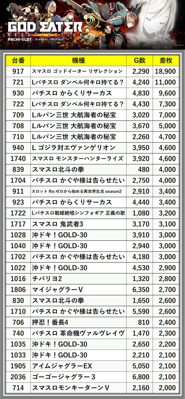 厳選された取材対象機種をはじめ、その他スロット全体から好記録が飛び出した!プレイヤーが楽しんだ1日を下記データにて振り返ってみて欲しい。