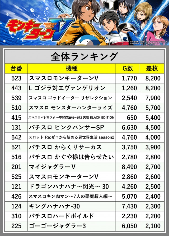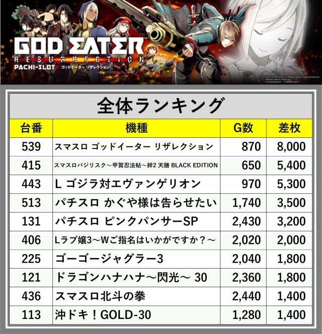 ※差枚数順に掲載しています