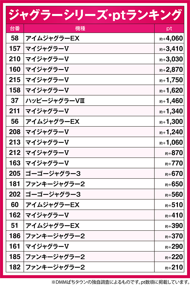 12台がプラスとなった「マイジャグラーⅤ」は、157番台と210番台が約+3,000pt以上。