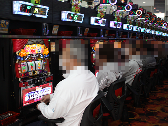 8割以上が埋まっていた「マイジャグラーⅤ」にも、楽しそうに過ごしているプレイヤーが多い。