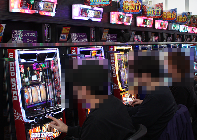 「スマスロ ゴッドイーター リザレクション」が満席となっており、プレイヤーはうれしそうに遊技中。