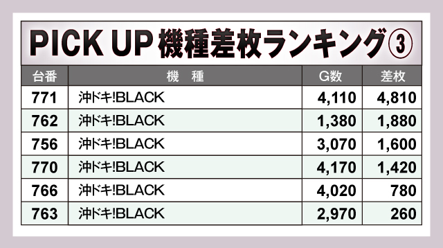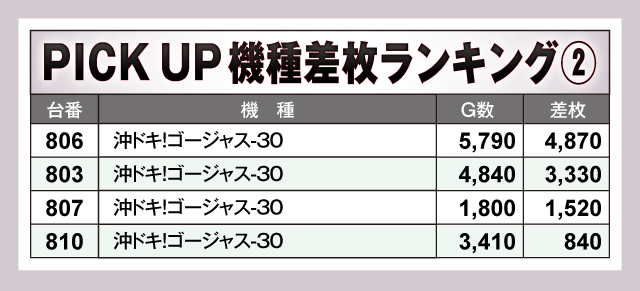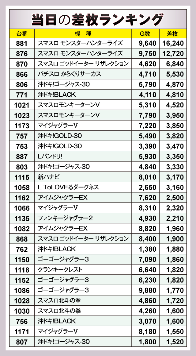 差枚ランキングを個別に見てみると万枚を達成した『スマスロ モンスターハンターライズ』2台は、いずれも9,000G以上まわしていて、性能を十分に発揮させるにはG数が肝要であることがうかがえる。『沖ドキ!ゴージャス-30』と『沖ドキ!BLACK』に関しては多少、不発となってしまった台もあるが、+4,000枚を超えた台は総じてG数も4,000Gを超えている点に注目したい。