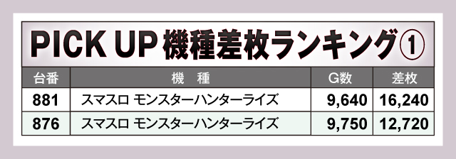 華々しく首位の座をかっさらったのは『スマスロ モンスターハンターライズ』。881番台が+16,240枚、876番台が+12,720枚と、ダブルで万枚オーバーの大成果をあげている。続いたのは『スマスロ ゴッドイーター リザレクション』で、870番台が+6,840枚、少し差がついて868番台が+1,900枚となった。