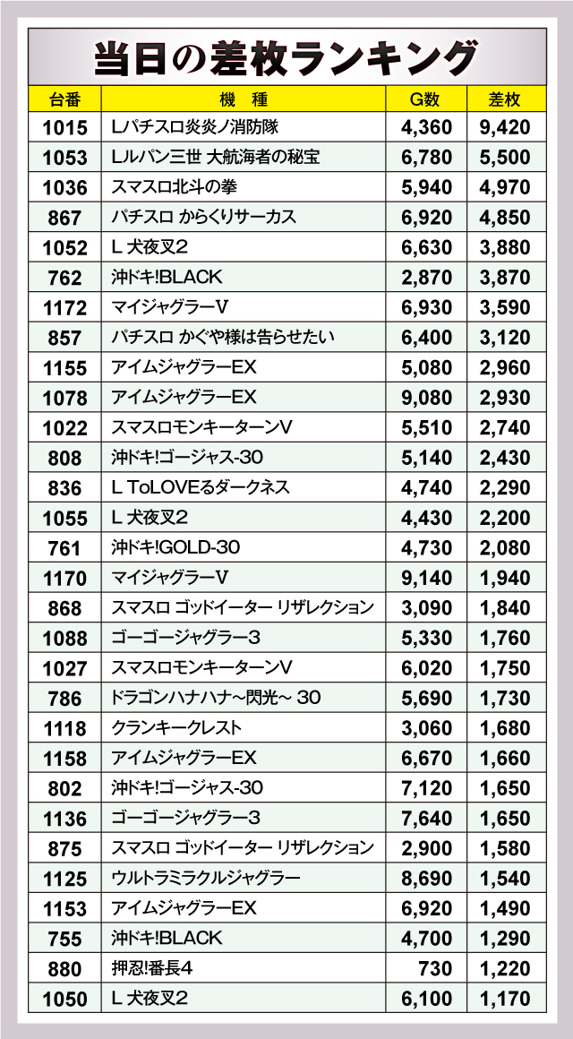 差枚トップ30台を見てみると、30台のうち半分の15台が+2,000枚オーバーを記録しており、今回も大きな盛り上がりのうちに終了。このままの勢いで、次の「英雄のリアル」も大成功に導きたいところだ。