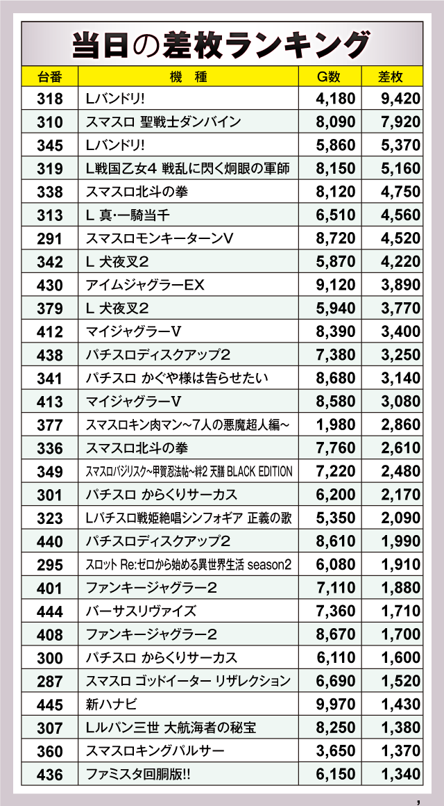 この日は人気のスマスロを中心に好調台を多数確認。そんな中、最もプレイヤーの注目を集めたのが『Lバンドリ!』で、318番台が万枚目前の+9,420枚を叩き出しランキングトップに輝いた。また、『スマスロ北斗の拳』や『スマスロモンキーターンV』といった定番の人気機種からも+4,000枚超が飛び出している。